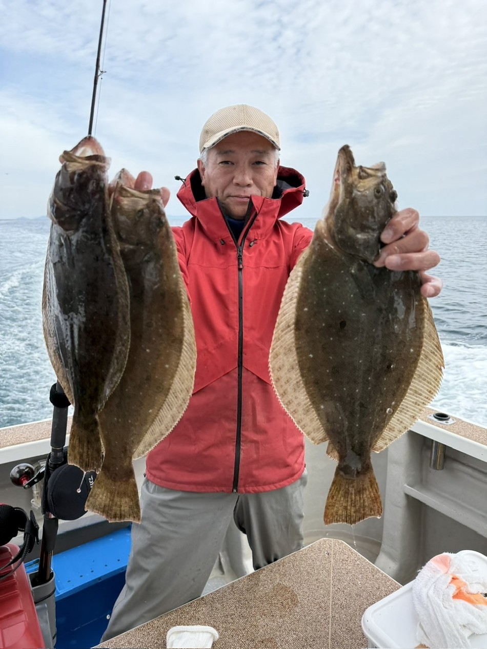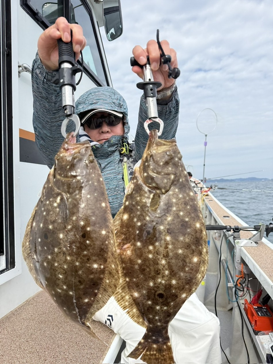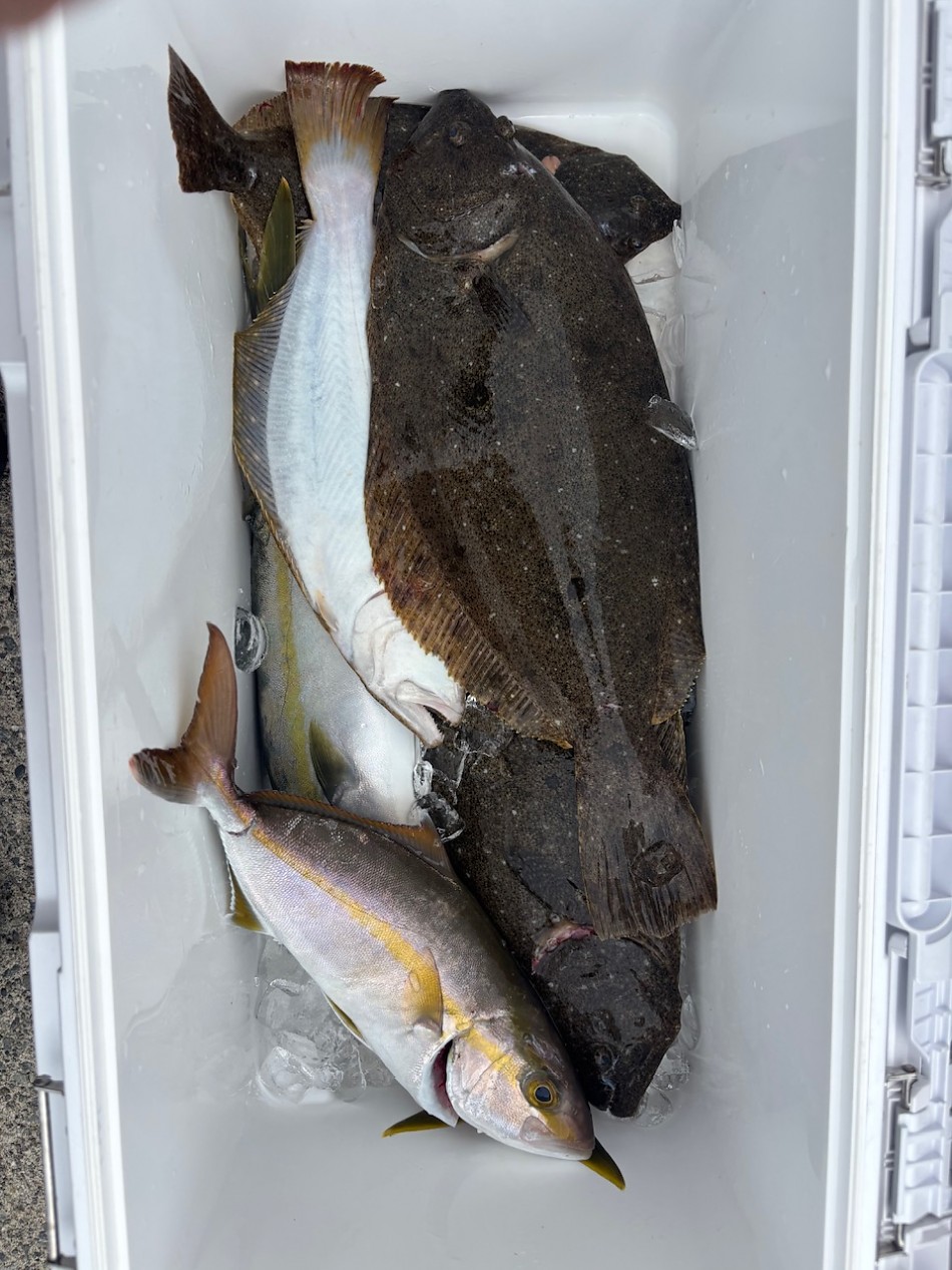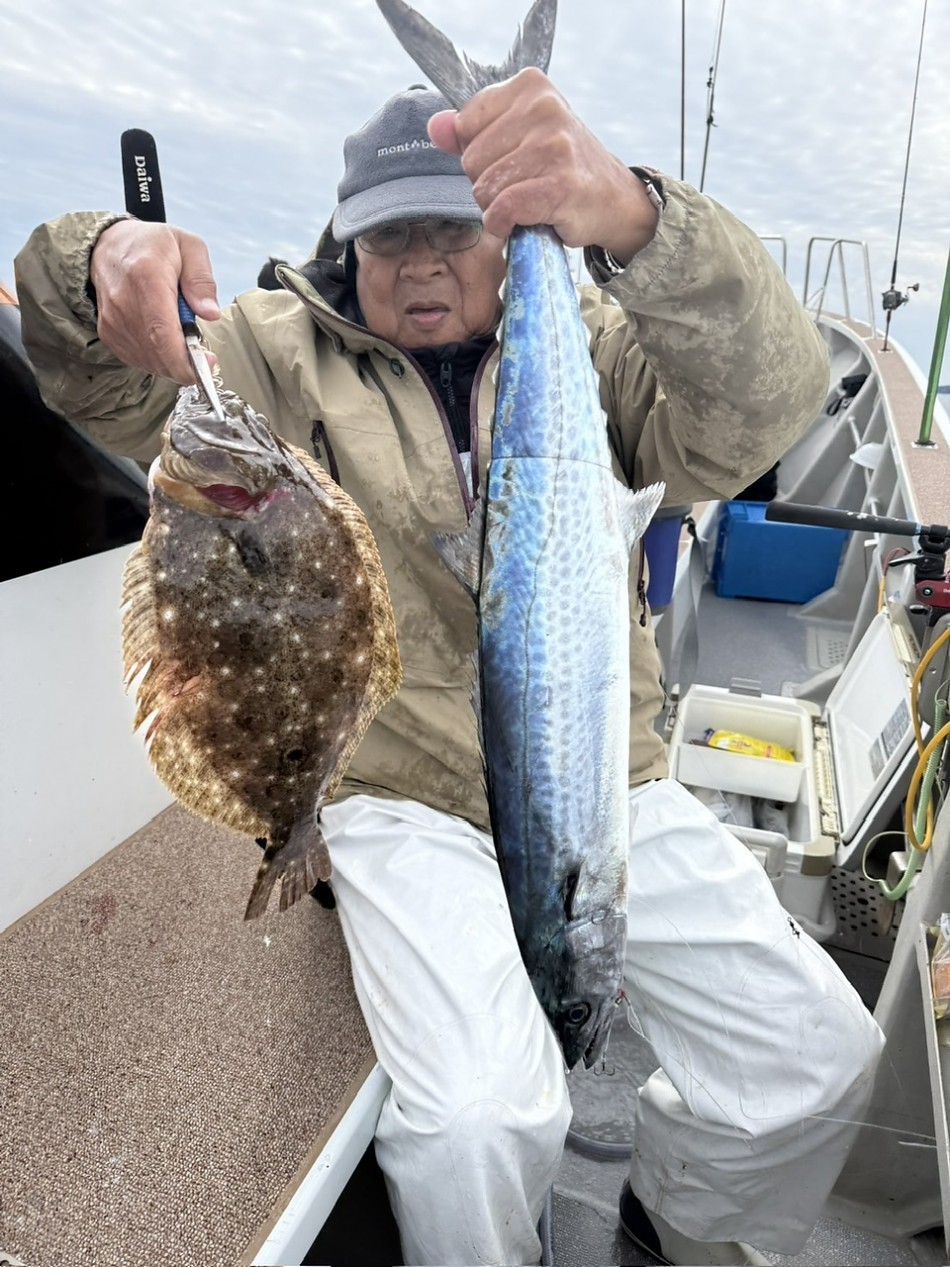 今日のヒラメ釣りは竿頭4枚が2名で船中22枚釣れました!後半にベイト反応発見で、サワラやシオ・カンパチ・大ハマチや真鯛など色々と釣れました!