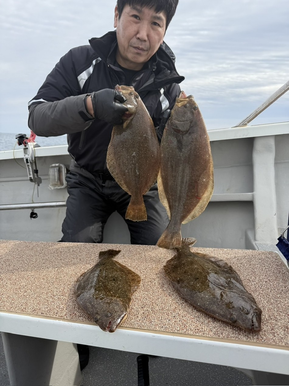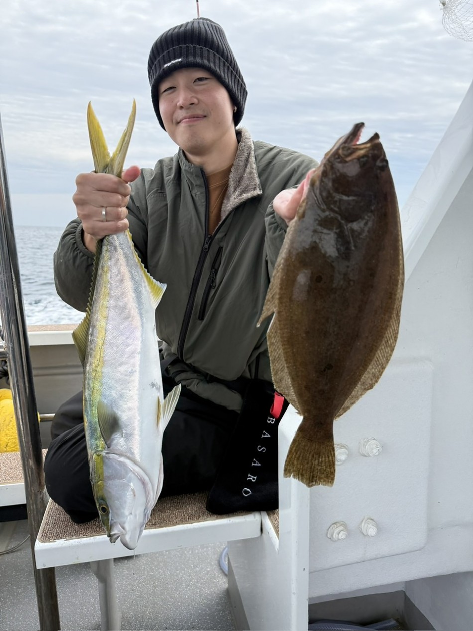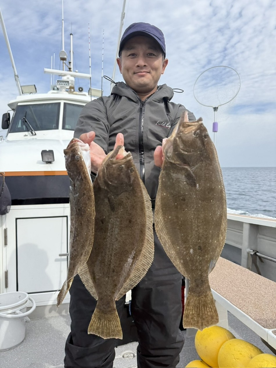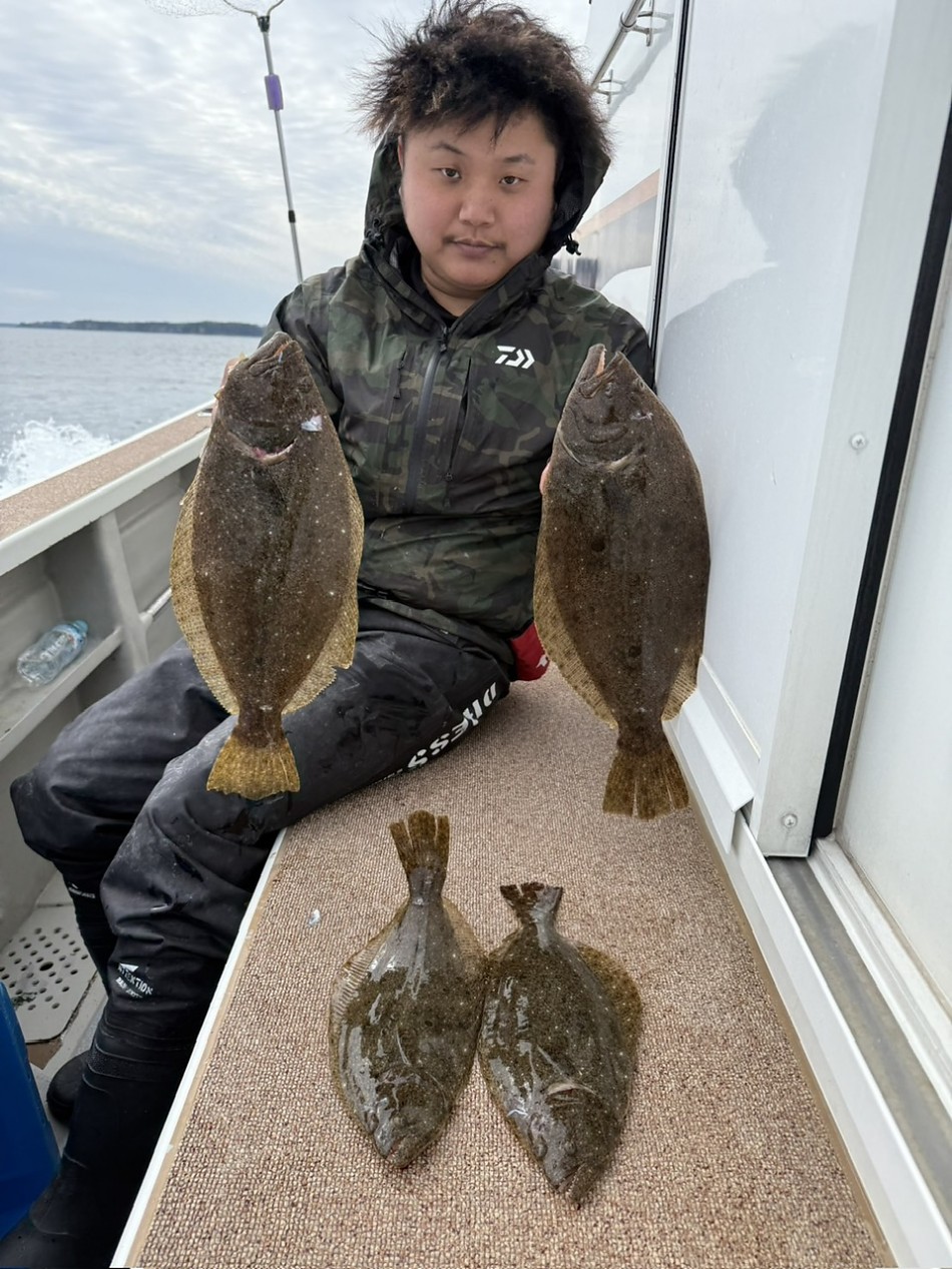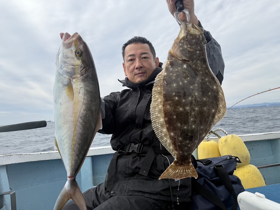 今日のヒラメ釣りは竿頭4枚が2名で船中22枚釣れました!後半にベイト反応発見で、サワラやシオ・カンパチ・大ハマチや真鯛など色々と釣れました!