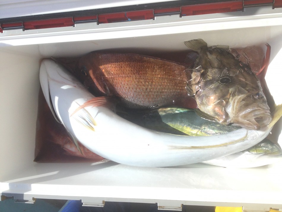 今日は朝から魚の活性良く入れ喰いで大漁です(^^)ヒラメ、ブリ、ワラサ、サワラ、真鯛と絶好調!!ハリス切れやバレていくのも結構ありました。
