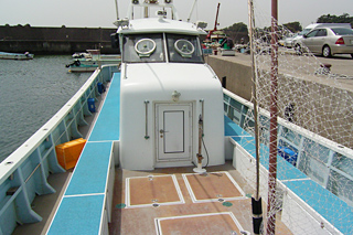客室(キャビン)、冷暖房完備(8人)。電動電源、各釣り座付海水ポンプ、各釣り座付